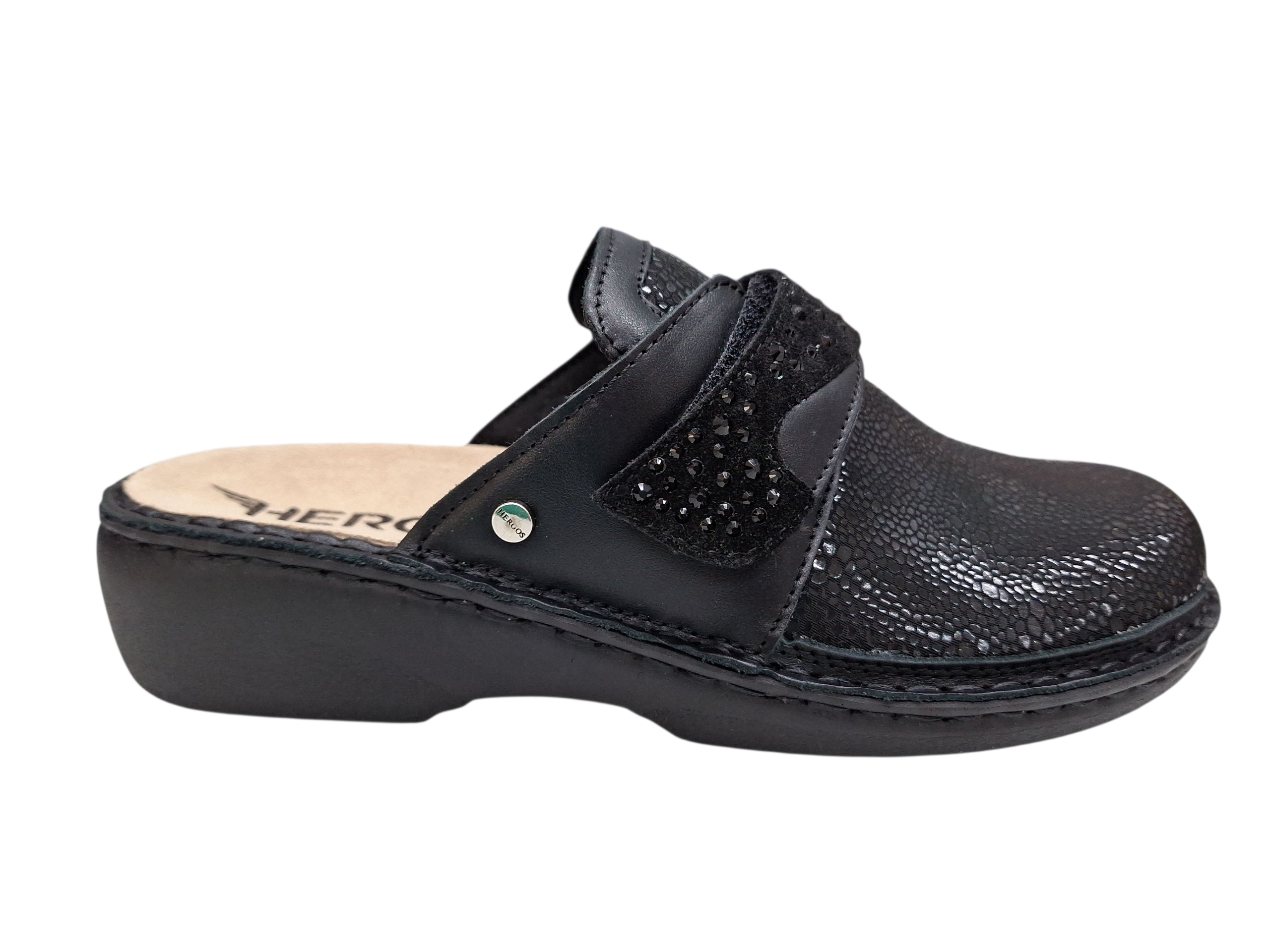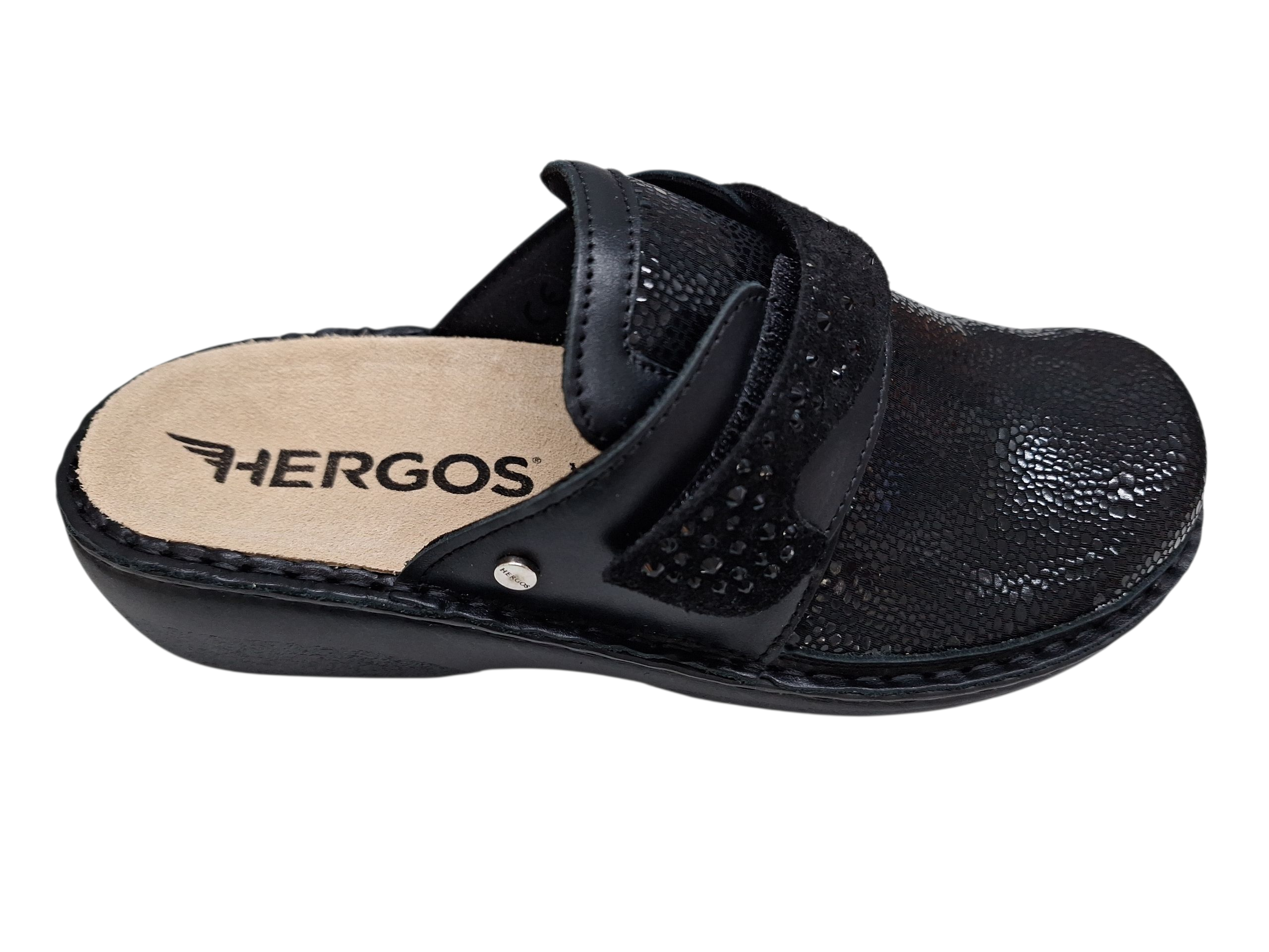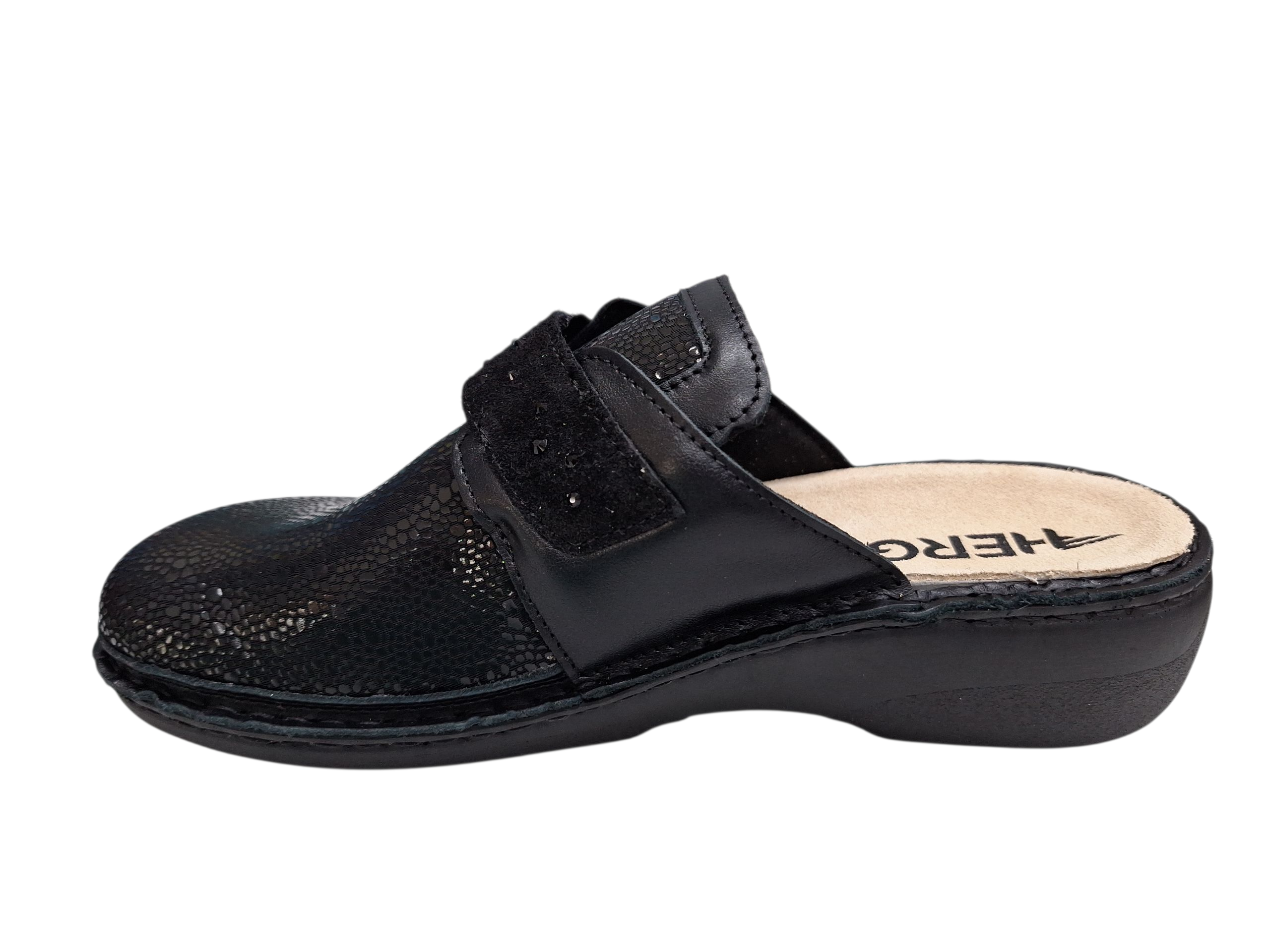 Eleganti ciabatte della linea predisposta di Hergos modello H1718. Dotate di un plantare anatomico estraibile e sostituibile anche con plantare su misura. Tomaia elasticizzata nella parte superiore